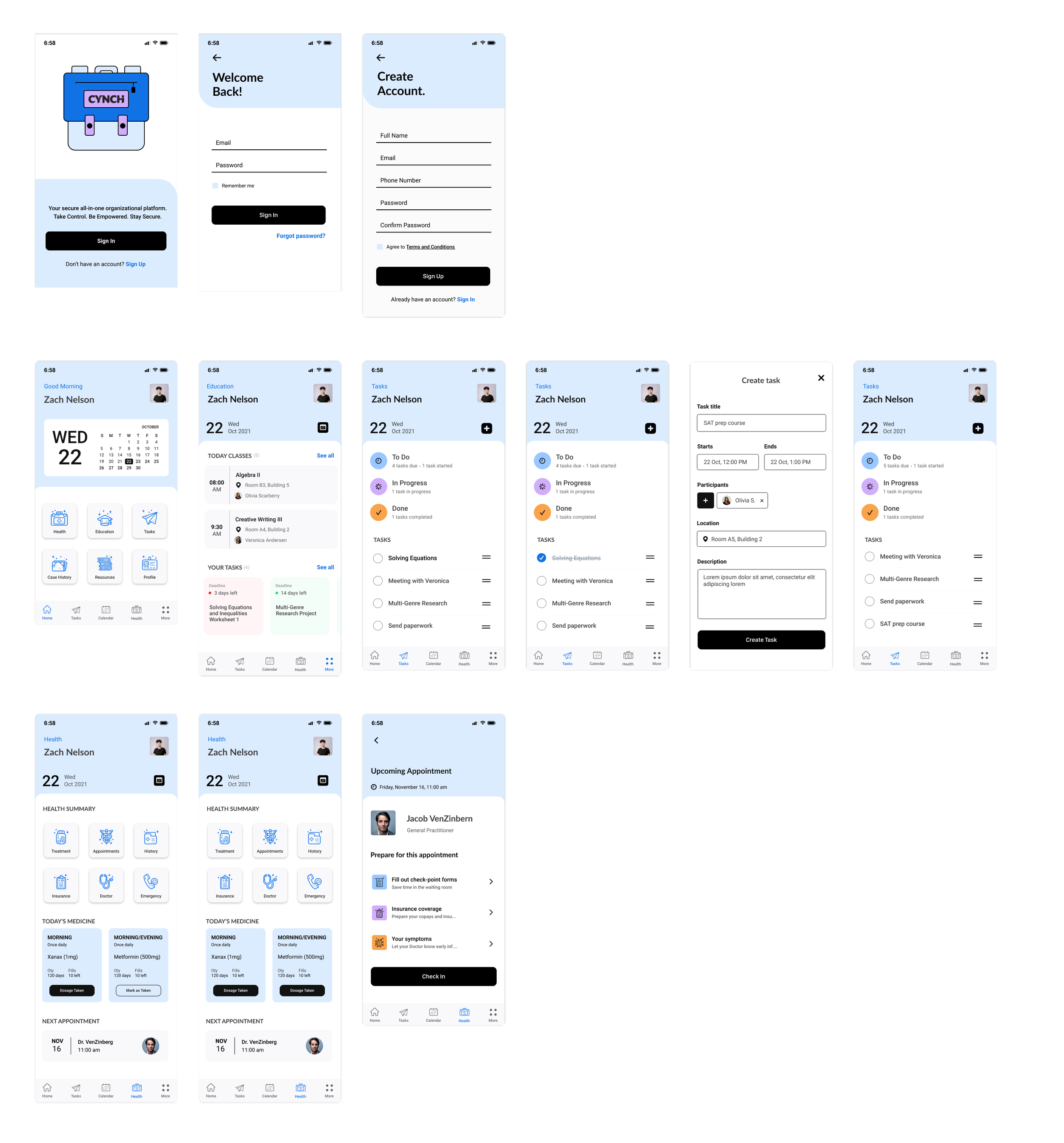 Medical history and appointment overview. Ability to fill out forms and check in appointments.